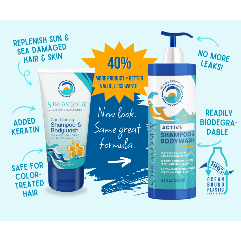 New updated design, same formula! Cleanse, condition and strengthen your hair and skin with Stream2Sea’s Conditioning Shampoo and BodyWash, with Stream2Sea's powerful antioxidant blend of Green Tea, Tulsi, Wakame, and Olive Leaf.