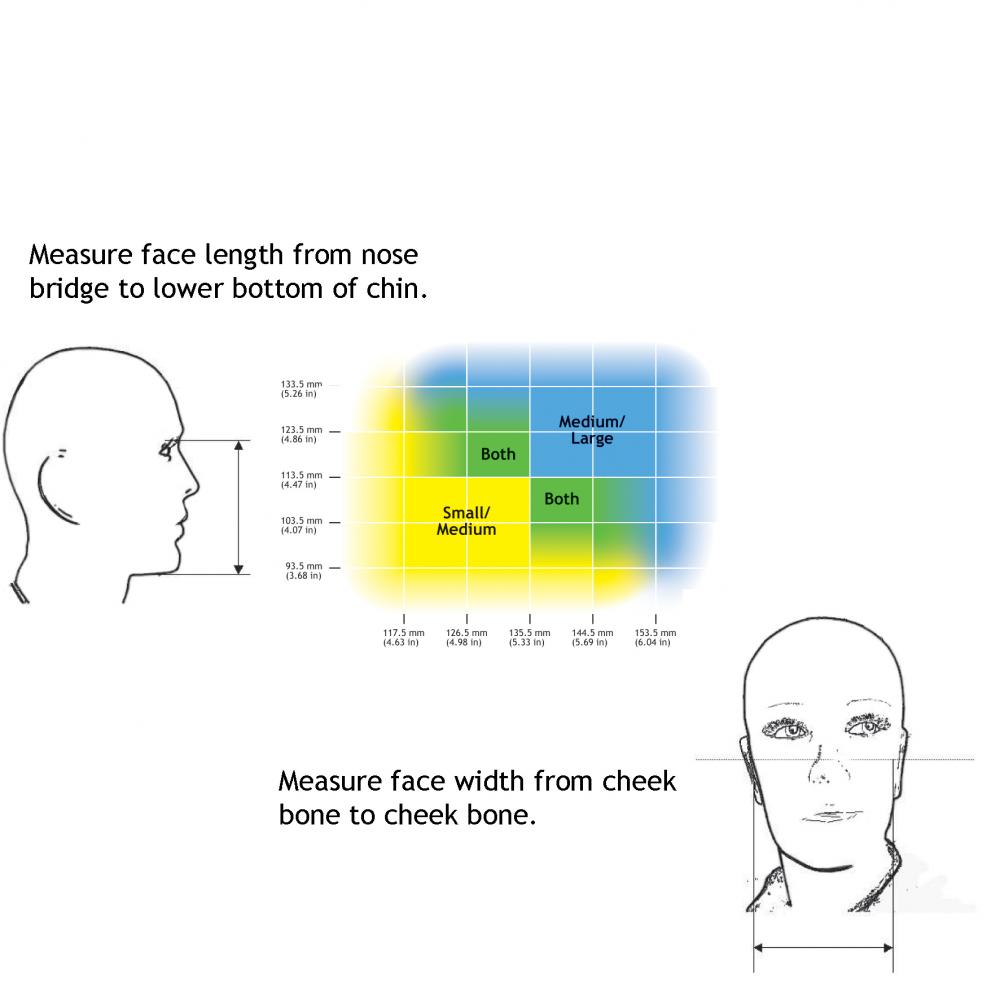 The Space Extender is available in two sizes, Small/Medium and Medium/Large. The sizing and measuring system were designed in accordance with the official measuring procedure used in the Los Alamos Scientific Laboratory Charts at the SBCCOM Mask Fit Facility-Aberdeen Proving Ground (Maryland, USA). Before purchasing a mask, the customer may use the caliper to take two simple face measurements. Using the Full Face Mask Size Recommendation Chart, he or she can evaluate the size category into which the measurements fall. There are three different size categories on the chart: Small/Medium, Both, & Medium/Large. If the measurements fall within the Both category, the diver should technically be able to wear either full face mask (M/L or S/M), and in that case, should try on a mask to select the best fit. Please note that the chart boundaries fade. The fading areas represent less common face measurements. It is very likely that a mask will still fit comfortably even if measurements are located in these fading areas. If you have any questions about sizing simply stop by the dive center and we will properly fit you for your new IDM.