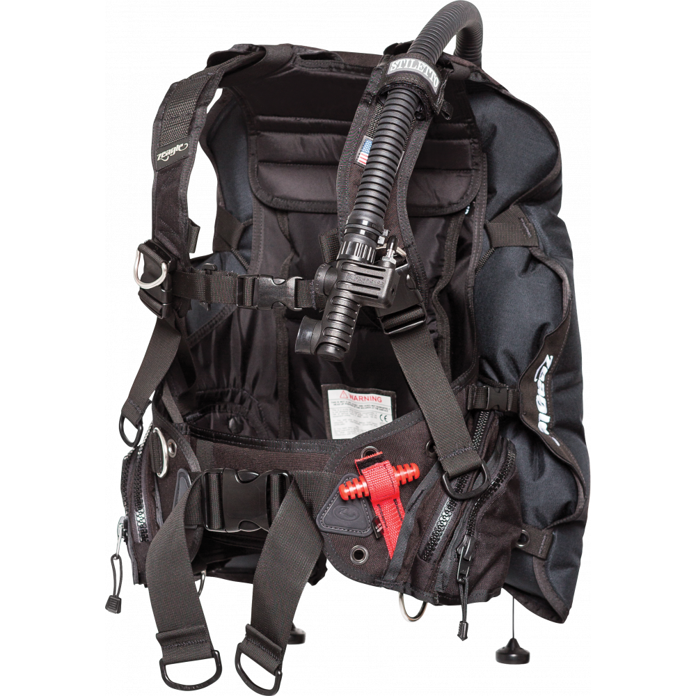 Stiletto has a 24 lb capacity Ripcord Weight System®, a 16 lb capacity rear mount trim weight system, and is reinforced with 1000 Denier Nylon construction. It comes standard with a 35 lb low profile, heavyweight bladder with elastic retractor, and features two zippered utility pockets capable of handling all your accessories for both local and travel diving.